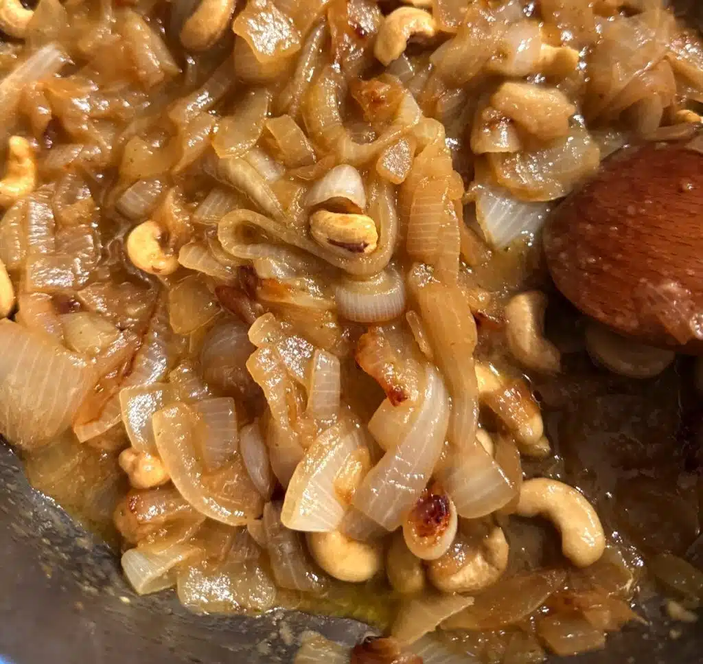 Caramelize the Onions: Slice the onions and cook them in ghee and olive oil over medium heat until they are caramelized, about 40 minutes, stirring frequently. Add the cashews to the last 5-10 minutes of cooking. Then add the garlic powder and broth.