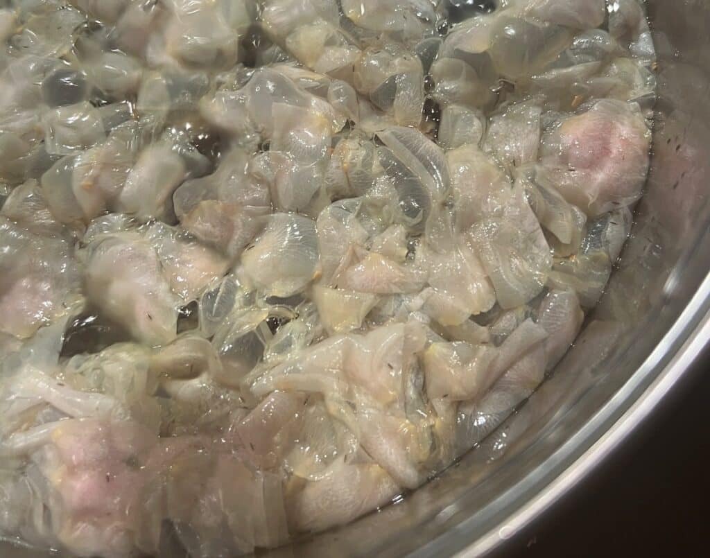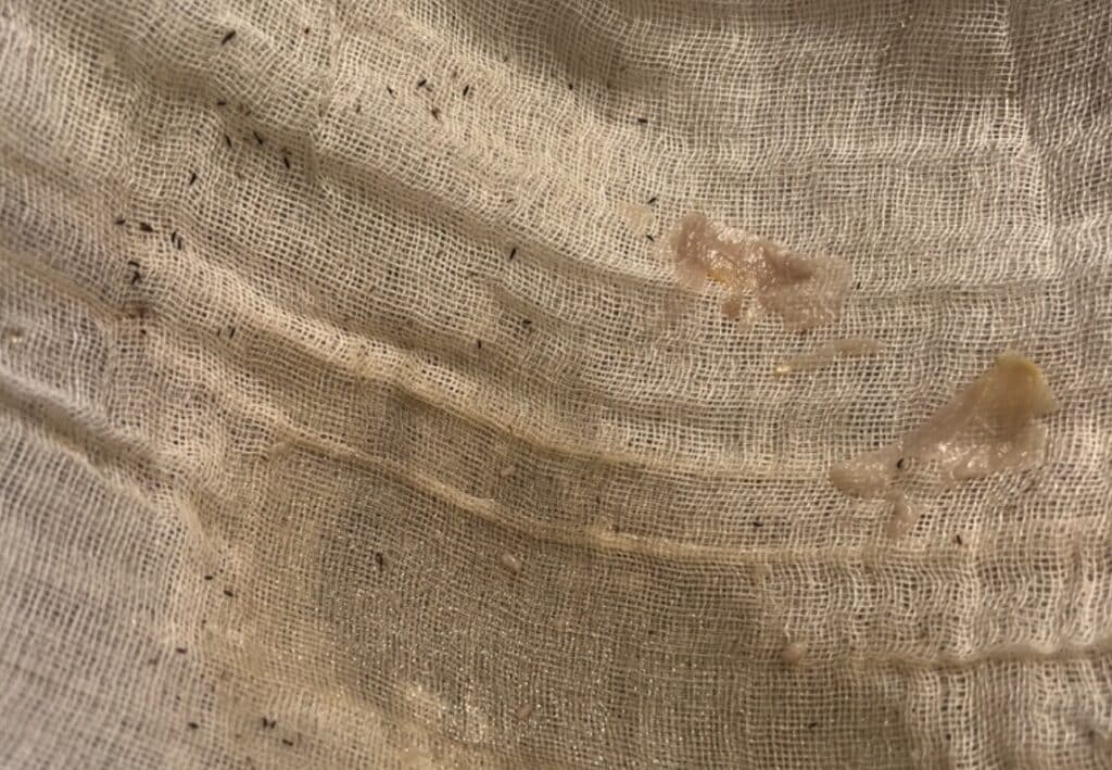 5. Place 3-4 layers of cheesecloth in a sieve and strain mixture into a large bowl to separate the petals from the water. You may need to stop a few times and scoop out the petals so the liquid can flow into the bowl easily.