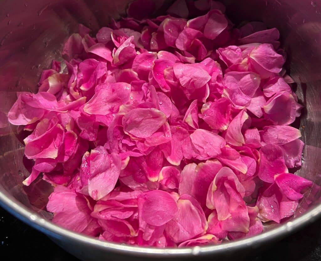 3. Cover saucepan and bring to a boil over medium-low heat. Do not remove the lid, shake the pot to ‘stir’ the petals. You want all steam to remain trapped in the pot (steam distillation) to retain the wonderful rose scent.