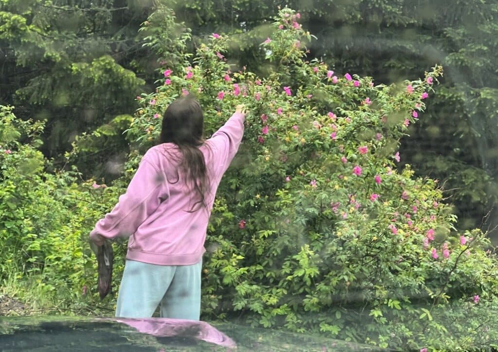 She couldn’t resist this bush, but I’d had enough of the rain by this point!